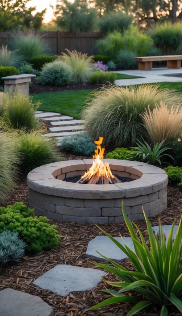 You can create a simple, natural look by planting low-maintenance grasses around your fire pit. These grasses add texture without needing much care. They stay green and soft, making the space feel cozy and easy to enjoy.