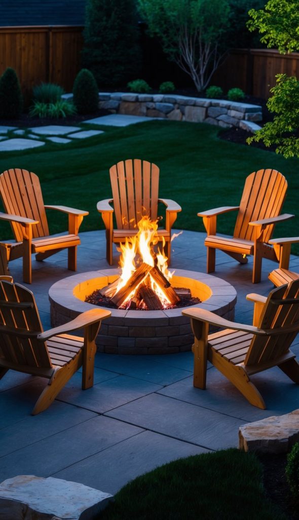 You can create a warm, inviting space with Adirondack chairs around your fire pit. These chairs are comfortable and easy to arrange in a circle for good conversation. Choose wooden or colorful, weather-resistant versions to fit your style.