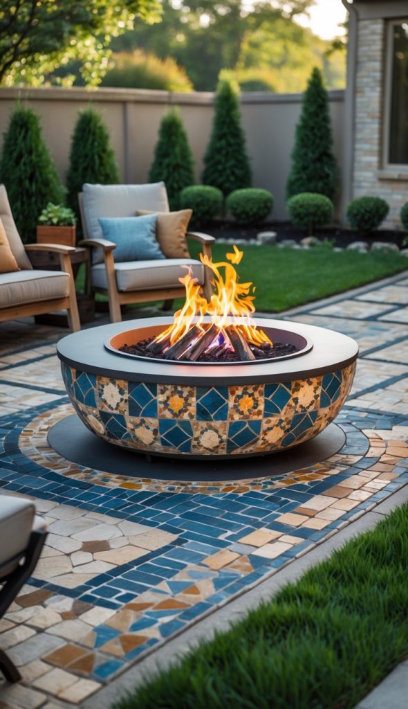 You can add color and style to your backyard with a fire pit that has a mosaic tile surround. Choose bright or neutral tiles to match your outdoor space. This simple detail makes your fire pit stand out and adds a nice touch without much work.