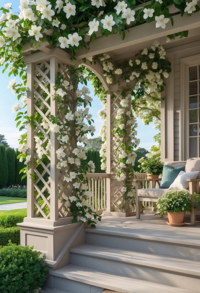 You can give your front porch a gentle, fresh look by painting your trellis in soft pastel colors. Light shades like pale blue, mint green, or soft pink add charm without being overpowering.