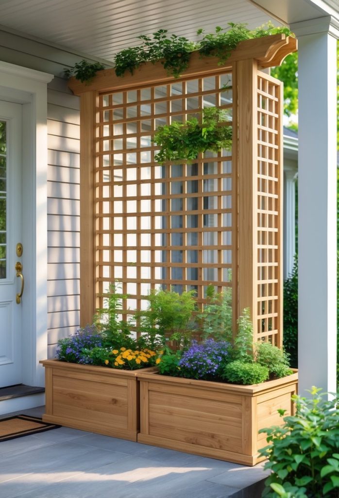 You can add both beauty and privacy to your porch with a wooden trellis that has planter boxes built in. This lets you grow climbing plants like vines or flowers that create a natural screen.