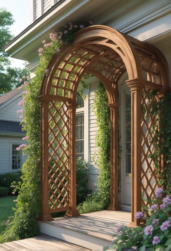 You can add charm to your side porch with a classic wood trellis shaped in an arch.