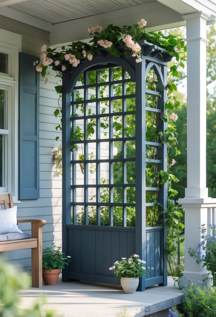 Painting your trellis in this dark shade helps it stand out while blending well with greenery. It also makes your porch feel cozy and inviting.