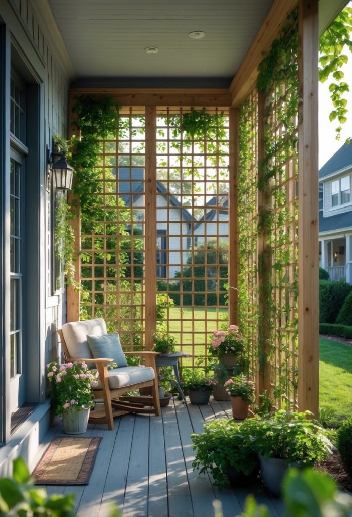 Tall trellis panels are a great way to block neighbors’ views while still letting light in. You can place them along your porch or near windows to create a natural screen. Adding climbing plants, like vines, makes the trellis look even better and adds extra privacy. These panels give you a simple way to enjoy your porch without feeling watched.