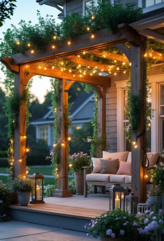 You can add charm to your front porch by weaving outdoor string lights through your trellis. This simple touch creates a cozy, warm glow in the evening.