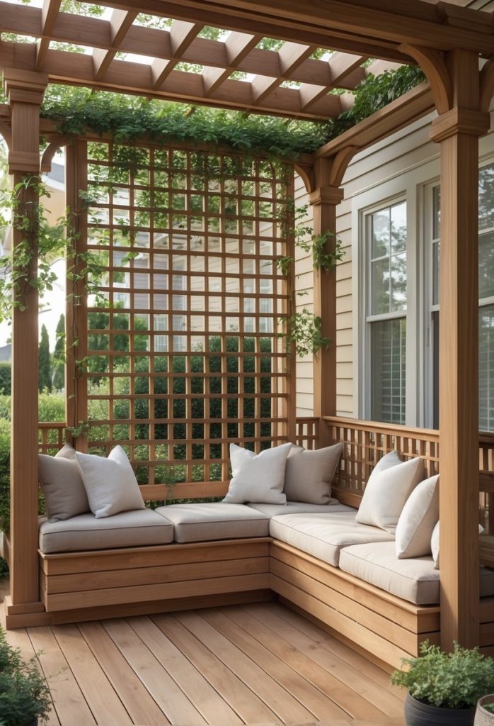 You can create a custom trellis that includes a built-in bench for a cozy spot on your porch. This design gives you a nice place to sit while adding some vertical interest with climbing plants.