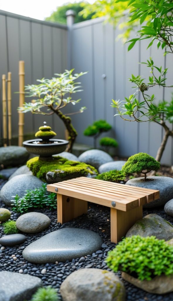 You can place a small bench in your garden to create a peaceful spot to sit and relax. A simple wooden or stone bench fits well without taking up much space. It lets you enjoy the sounds, sights, and calm feeling of your mini garden anytime.