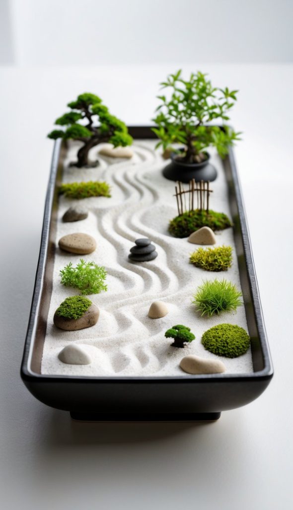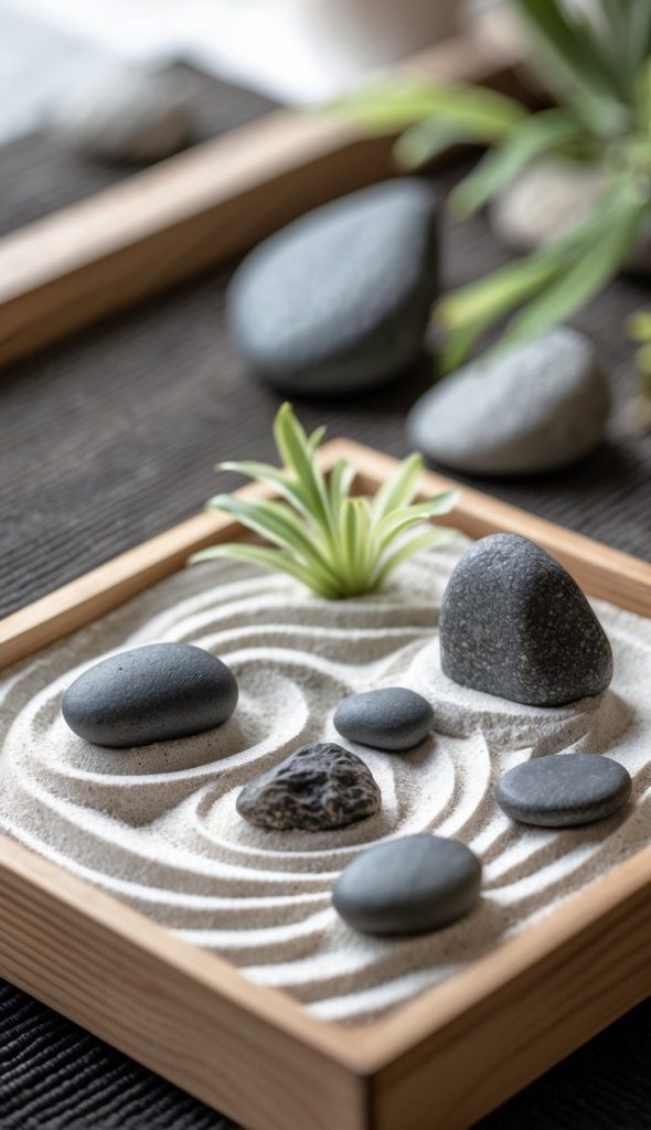 You can create a small Zen rock garden using white sand or fine gravel as a base. Add a few carefully placed stones to bring a sense of calm. This simple setup fits well in small spaces and helps you relax.