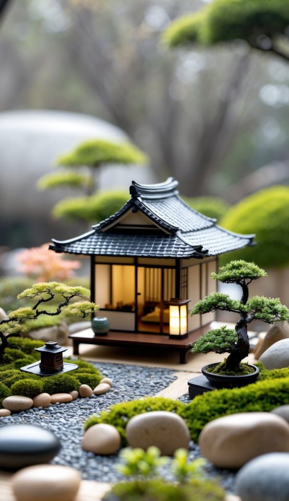 You can add a small Japanese tea house model to your garden. It creates a calm spot for your eyes to rest. This centerpiece brings a simple, peaceful feeling to your space. It also invites you to slow down and enjoy the moment.