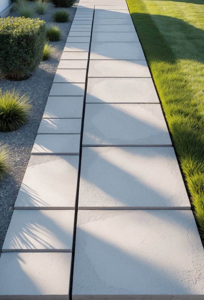 You can create a neat and modern look by using geometric concrete pavers. Simple shapes like squares or rectangles work well to keep the path clean and organized.