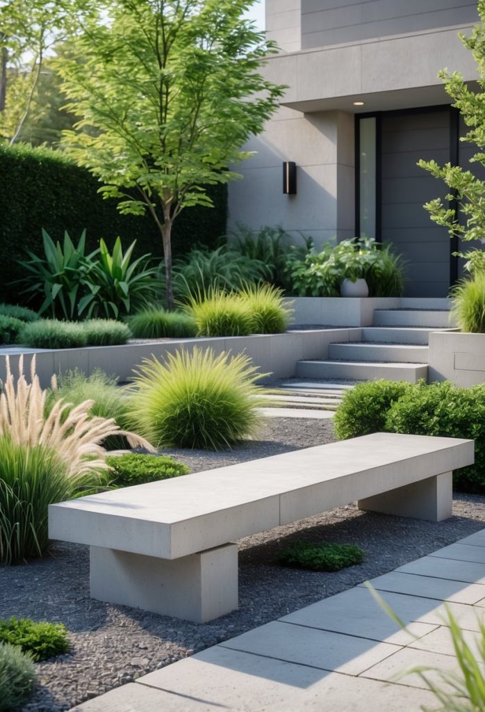 You can create a calm spot in your front yard by adding a concrete bench with a simple shape. Its clean lines fit well with modern, minimalist styles.