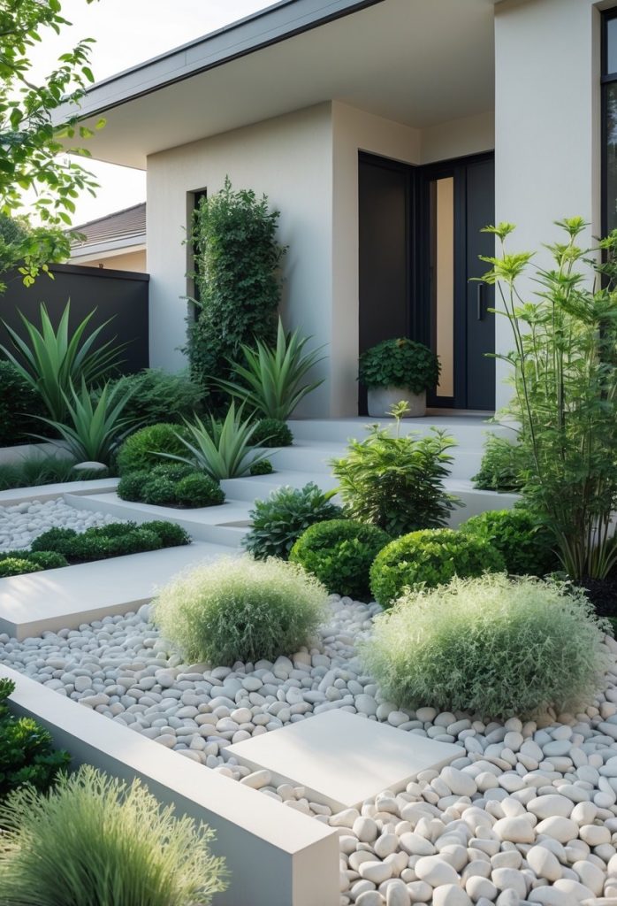 You can create a calm and stylish look by using different shades of green with white stones. The white stones add a clean, fresh touch that makes your plants stand out.