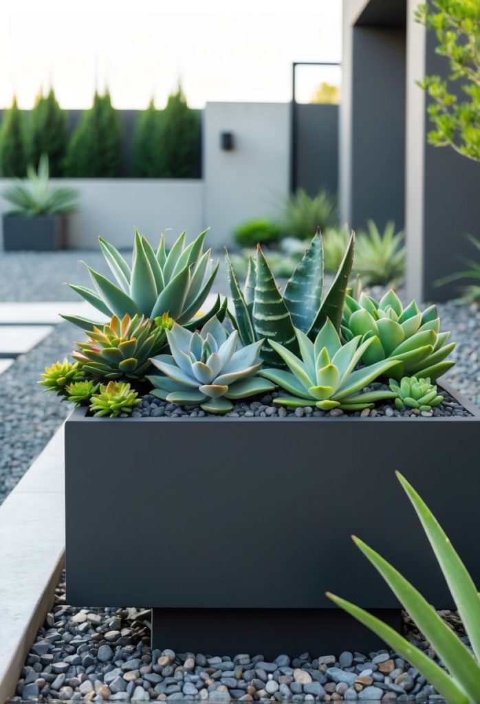 You can add a modern touch to your front yard with a simple succulent planter box. Choose clean, geometric shapes like rectangles or squares to keep the look sharp. Succulents need little water and care, making them easy to maintain.