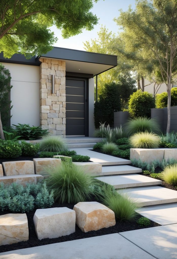 You can use ornamental rock borders to clearly define different areas in your front yard. These borders create a clean and organized look that fits well with a modern, minimalist style.