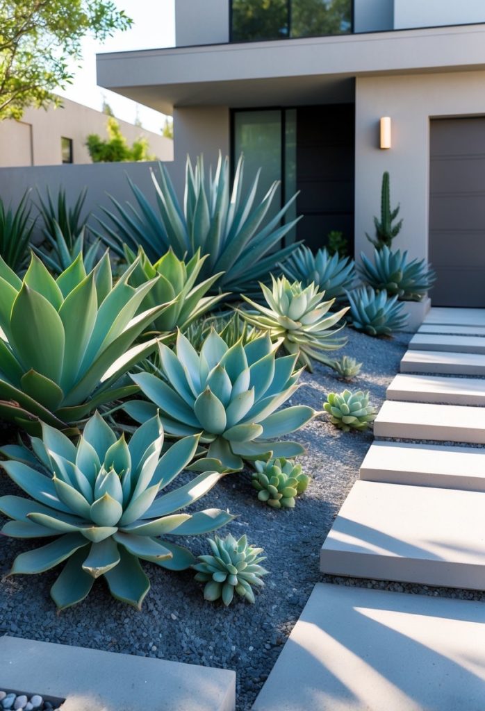 You can create a stylish front yard by planting succulents like agave and echeveria. These plants need little water and care, making them perfect if you want a low-maintenance garden.