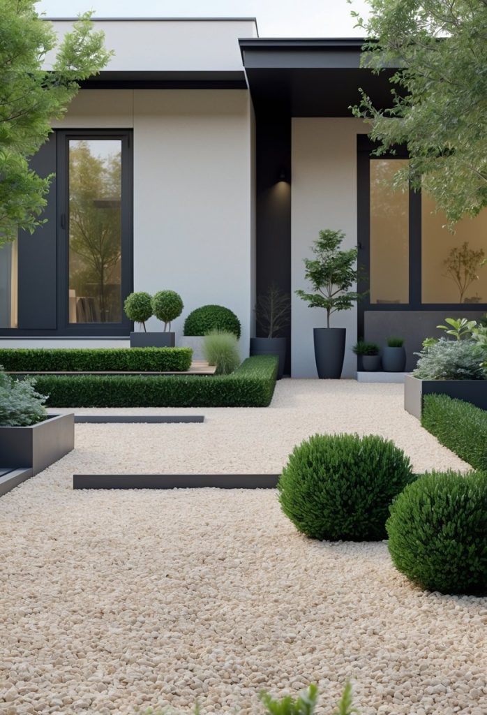 Gravel works well with modern and minimalist styles because it adds texture without being too busy. You can also pair it with a few plants or concrete elements for a balanced look. Gravel is a smart way to reduce weeds and water use too.