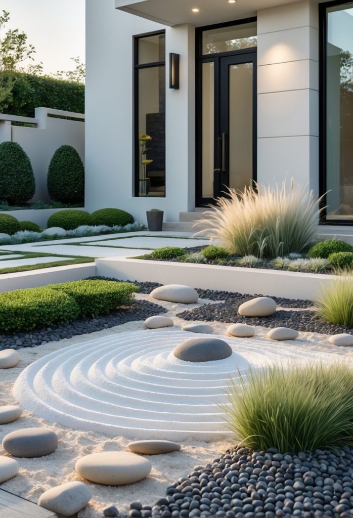 You can add a small Zen garden to your front yard for a calm, simple look. It uses sand, smooth stones, and sometimes moss or small plants.