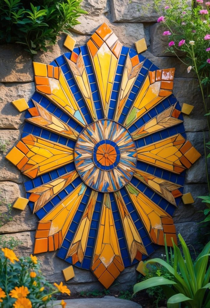 You can add warmth and brightness to your garden with sunburst tile mosaics. These designs use colorful tiles arranged in a circle to look like the sun’s rays. They work well on garden paths, walls, or tables and bring a cheerful vibe to your outdoor space.