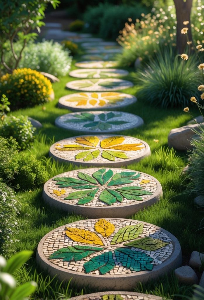 You can create stepping stones with beautiful leaf designs using colorful tiles or glass pieces. These add a natural touch to your garden path. Each stone becomes a small work of art, guiding your steps with simple, leafy shapes.