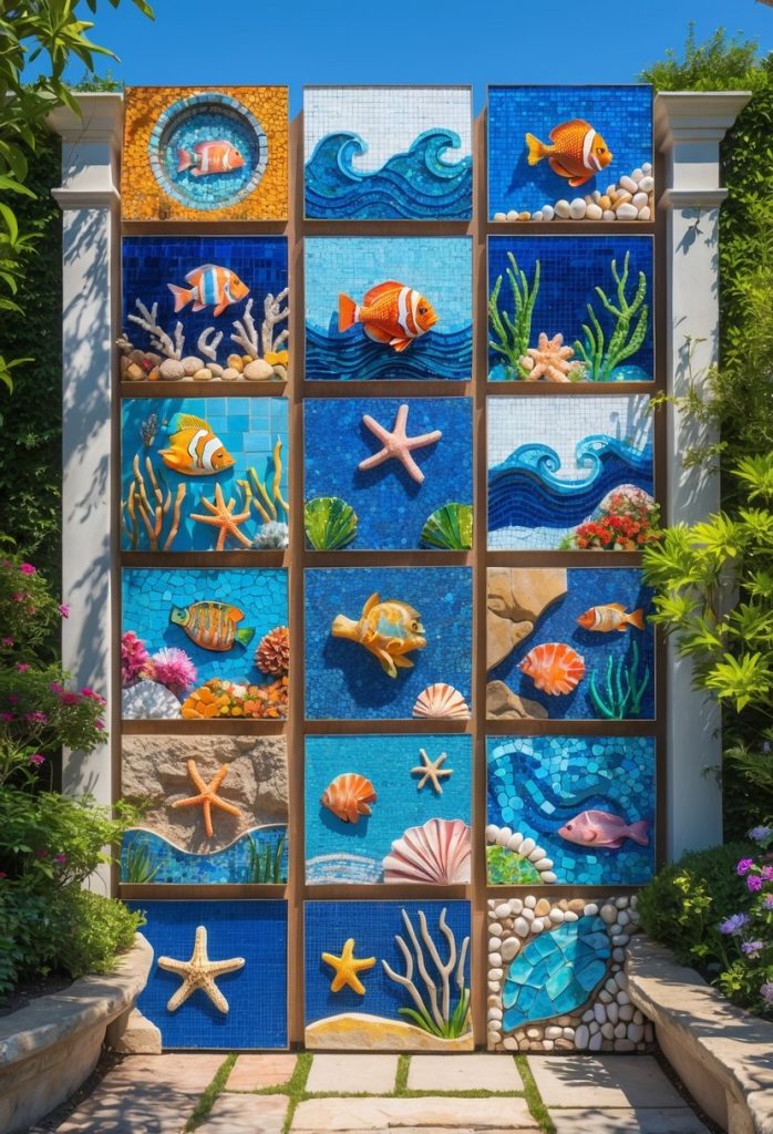 You can create sea-themed mosaic murals using shells, sea glass, and beach pebbles. These materials bring a calm, coastal vibe to your garden.