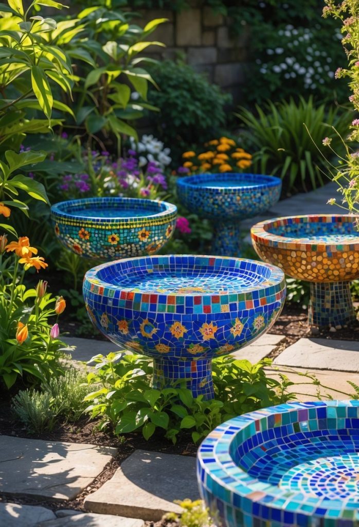 You can add color and charm to your garden with bright mosaic birdbaths. They catch the eye and make a great spot for birds to visit. You can buy one or try making your own to fit your personal style.