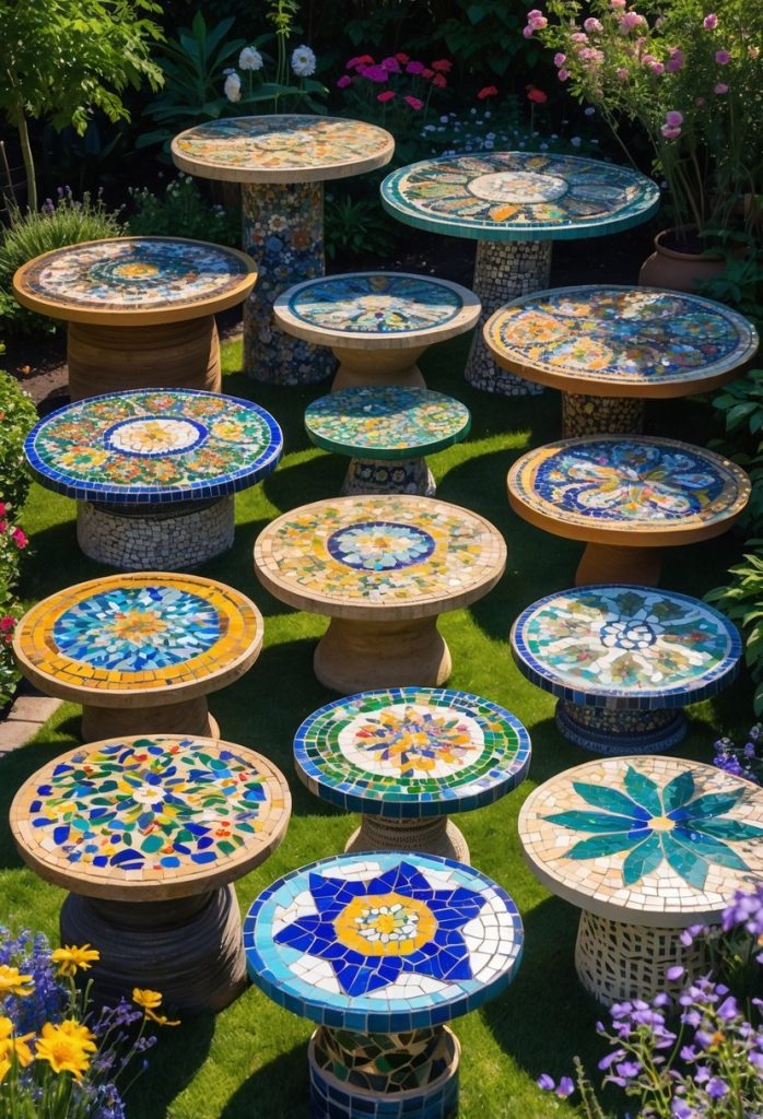 You can brighten your garden table tops with colorful mosaic designs. Using small tiles or glass pieces, you create patterns that fit your style. These table tops are easy to clean and add fun to your outdoor space. They make your garden seating area more inviting.