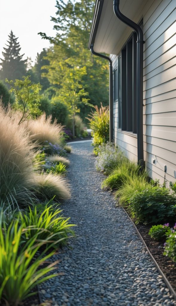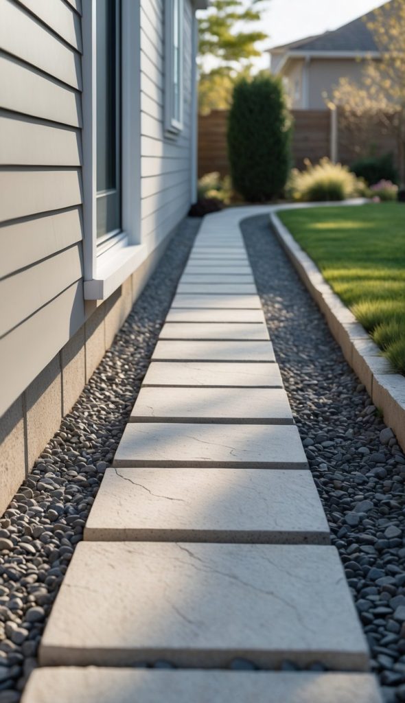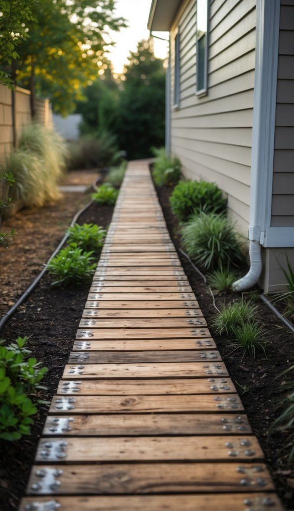You can use wooden boards to create a narrow boardwalk along the side of your house. This adds a warm, natural feel that fits well with rustic or farmhouse styles. It’s simple to build and works well with plants or gravel beside it.
