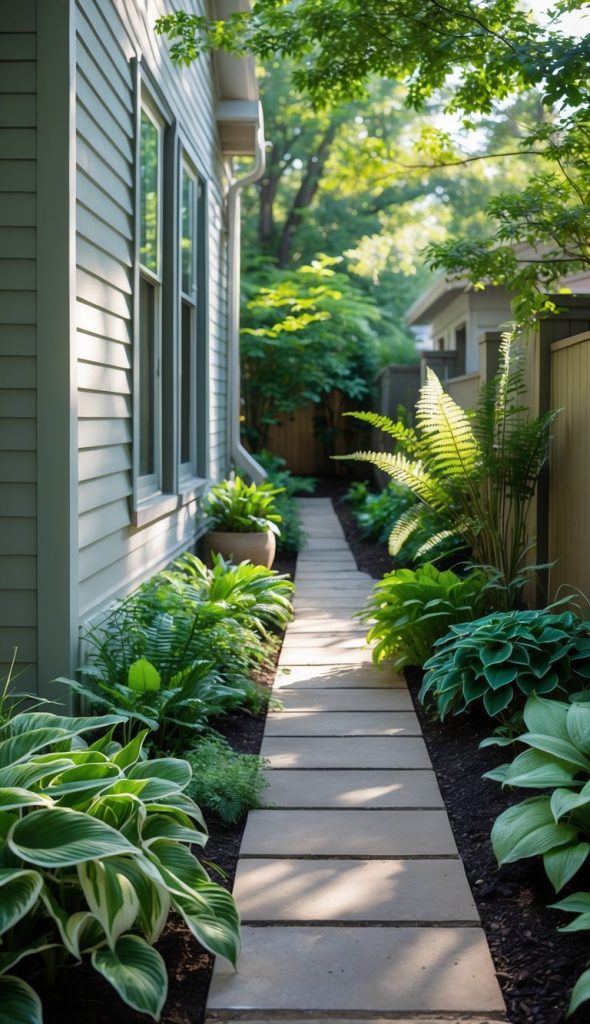 You can turn a narrow side walkway into a cool, shady nook. Use plants that grow well in low light, like ferns or bleeding hearts. Adding a small bench or curved wall gives you a cozy place to sit and enjoy your garden.