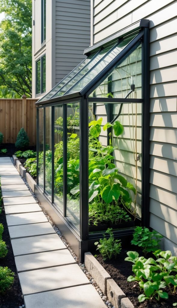 You can use a lean-to greenhouse along the narrow side of your house to save space. It fits against a wall, giving you one solid side for warmth. Just be careful with the walkway inside, so you don’t lose too much growing area.