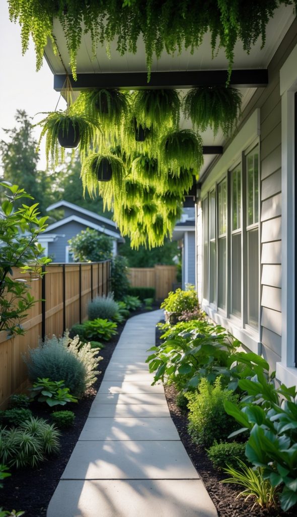 You can hang plants from your house’s eaves to bring life to the narrow space. This adds greenery above your walkway without taking up floor room.