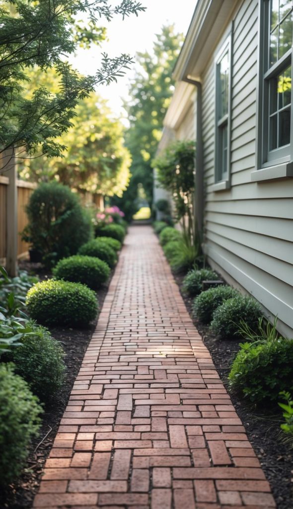 You can use bricks to create a classic walkway along the narrow side of your house. Brick patterns add a warm and inviting look that never goes out of style. They are strong and can handle foot traffic well. This choice will give your space a simple but charming feel.