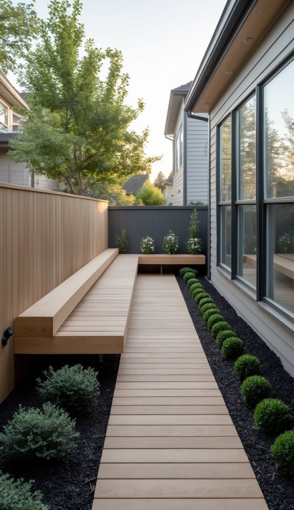 You can add a slim deck along your narrow walkway to create a cozy spot. Built-in seating fits well and saves space. This makes your walkway more inviting without taking up too much room.