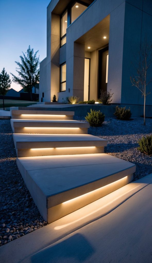 You can add LED lighting directly into your concrete stairs for a clean look. These lights make each step easier to see at night.