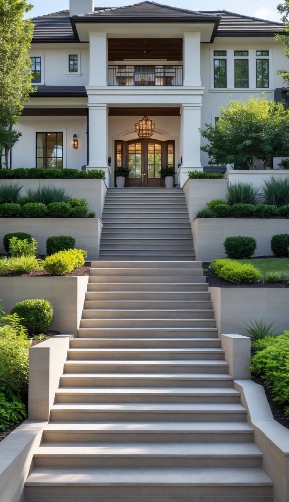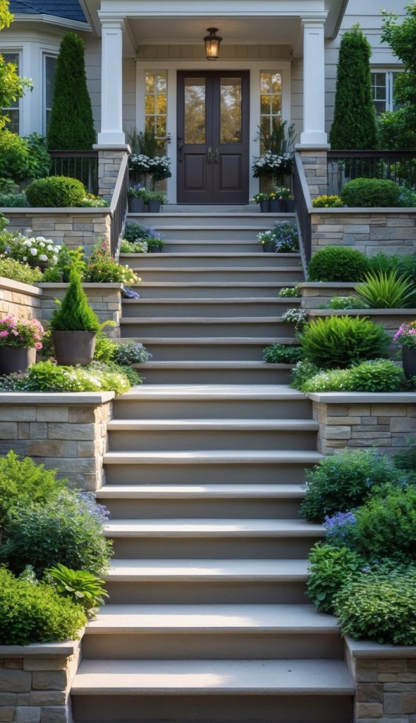 You can use terraced garden stairs to connect different garden levels to your front door. These stairs make your entryway feel natural and inviting.