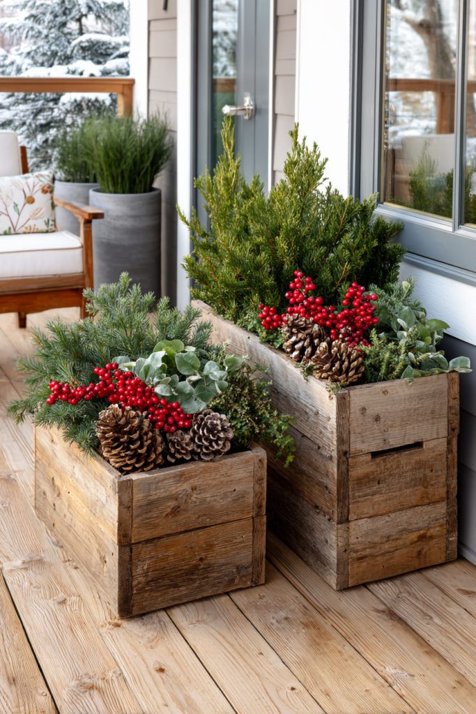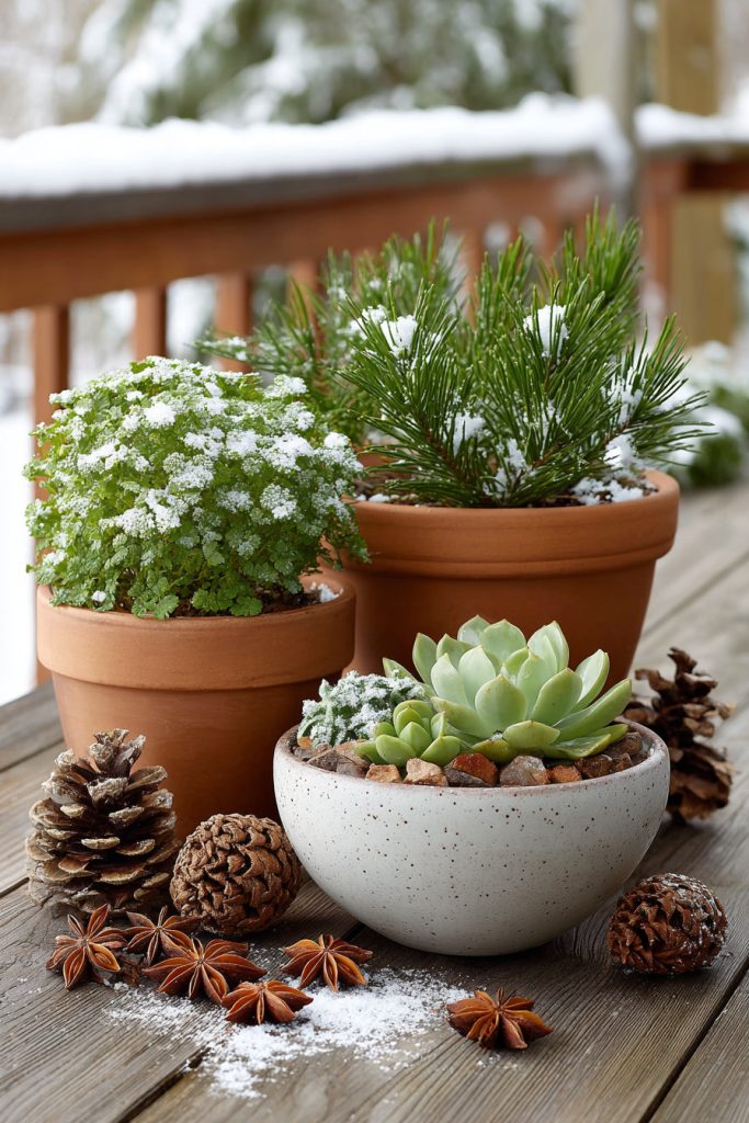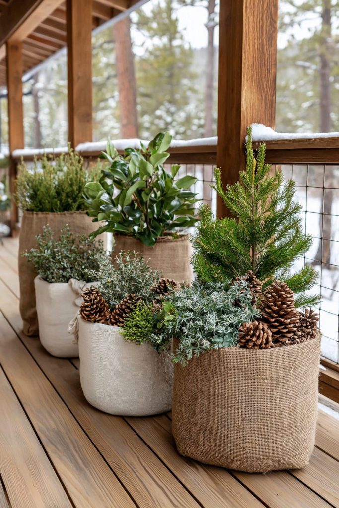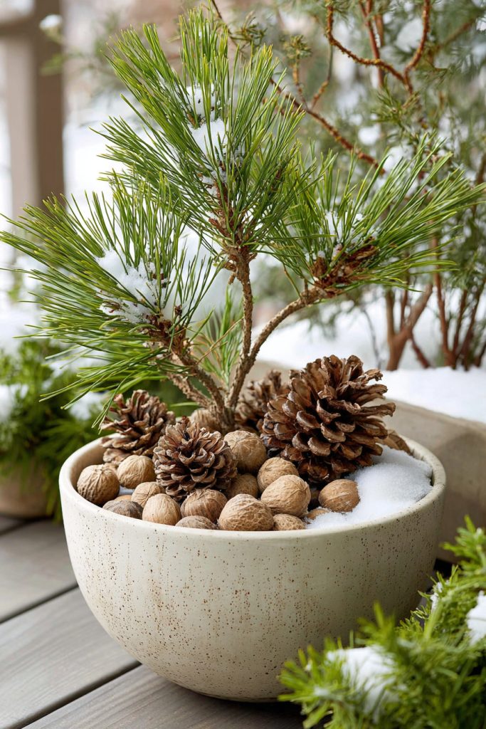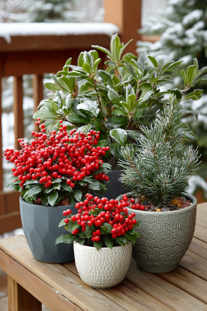 You can easily add charm to your winter planters using pine cones and cranberries. These natural items create a rustic look that fits the season well.