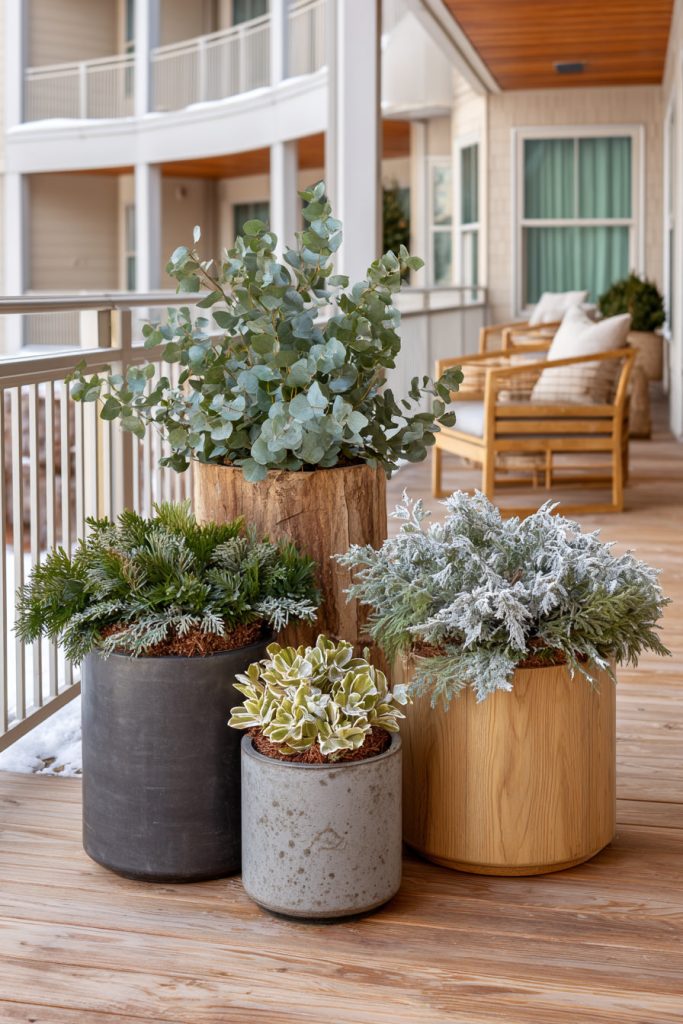 You can add preserved eucalyptus to your winter containers for a gentle touch of green. It stays soft and looks fresh even in cold weather.