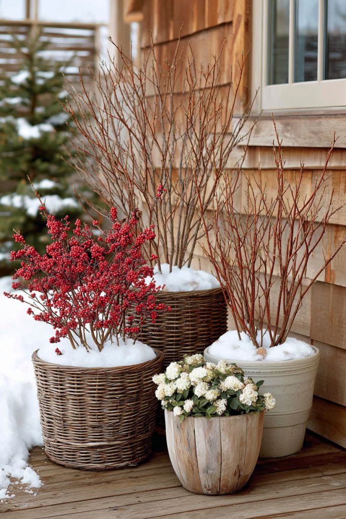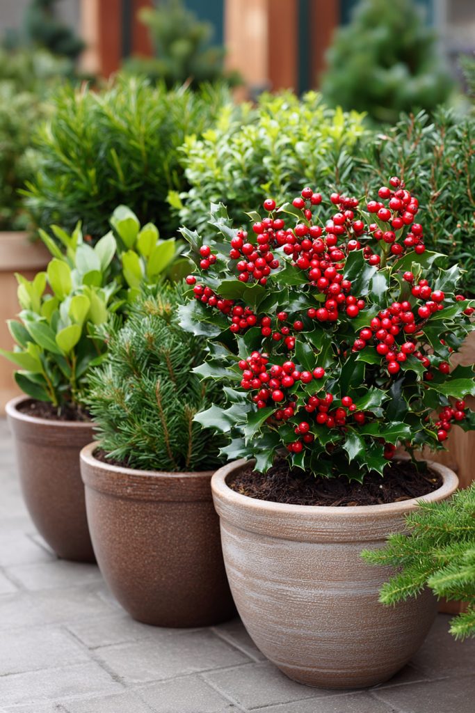 You can add bright holly branches to your outdoor containers for a simple way to bring holiday spirit. The shiny green leaves and red berries add color through winter.