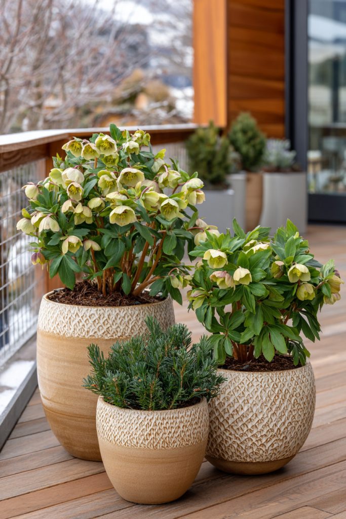 Hellebores need little care and bring pretty flowers that last through frost, making them perfect for winter containers.