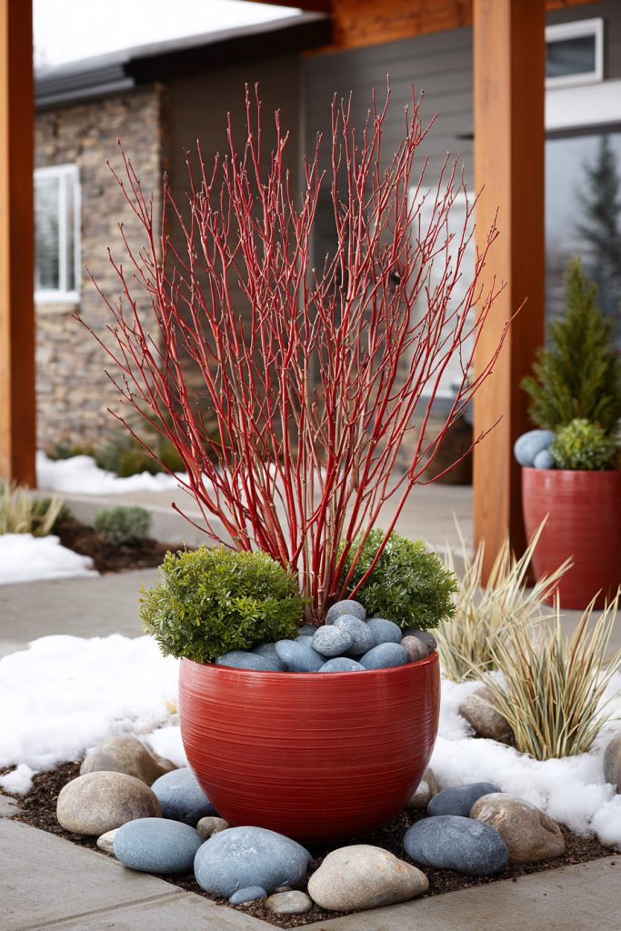 You can add bright color to your winter containers with red twig dogwood. Its red stems stand out well against snow or green evergreens.