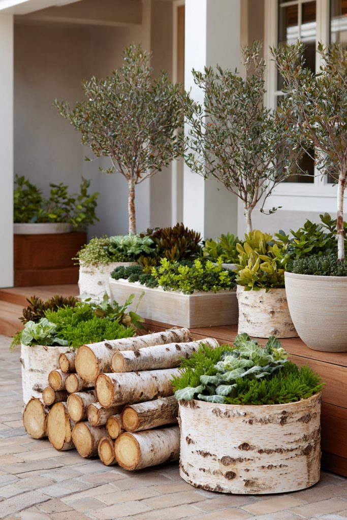 You can add a cozy, natural touch by stacking birch logs near your winter containers. The pale bark of birch logs stands out nicely against green evergreens.