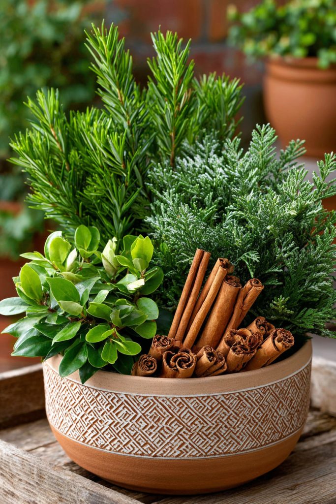 You can create a lovely winter scent by combining fresh evergreen sprigs with cinnamon sticks. The evergreens add a clean, natural smell, while the cinnamon brings warm spice.
