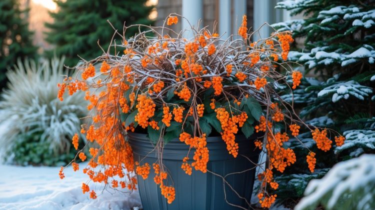 Outdoor winter container garden with bright orange bittersweet berries on vines, surrounded by snow-dusted plants and evergreen trees.