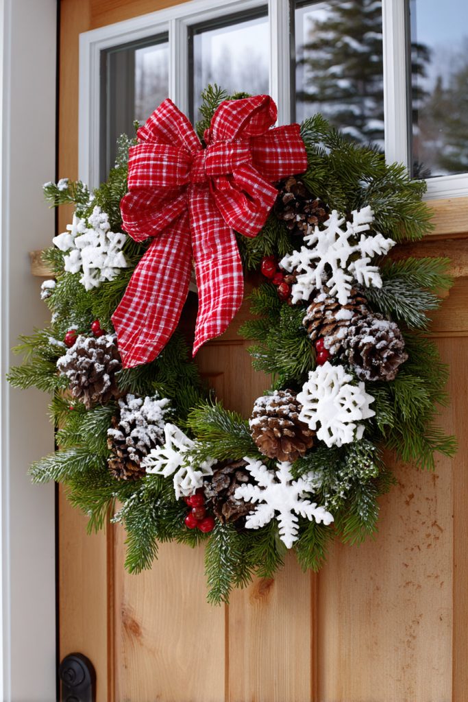 You can add charm to your front door with a snowflake and pine cone wreath. It usually features white snowflakes, pine cones, and red berries for a cozy look.