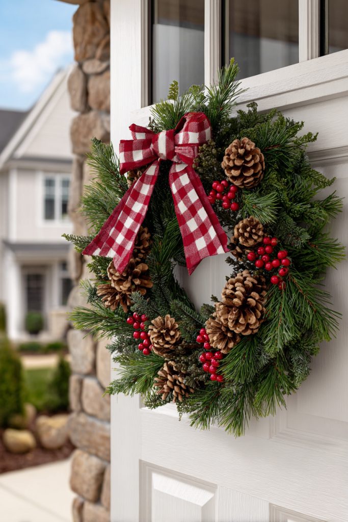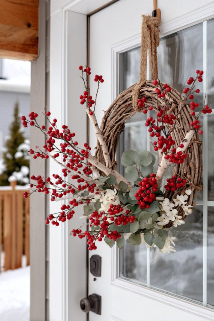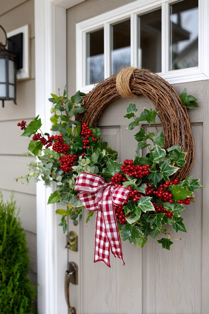 You can add a warm, festive touch with an ivy, holly, and red berry wreath. The mix of green leaves and bright red berries looks fresh and welcoming on your front door.