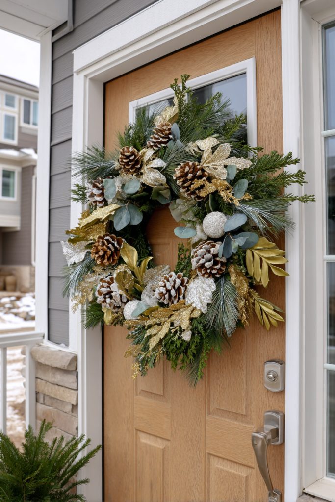 You’ll love this gold and silver glitter pine wreath for your front door. It has shiny pine cones and glittery berries that catch the light.