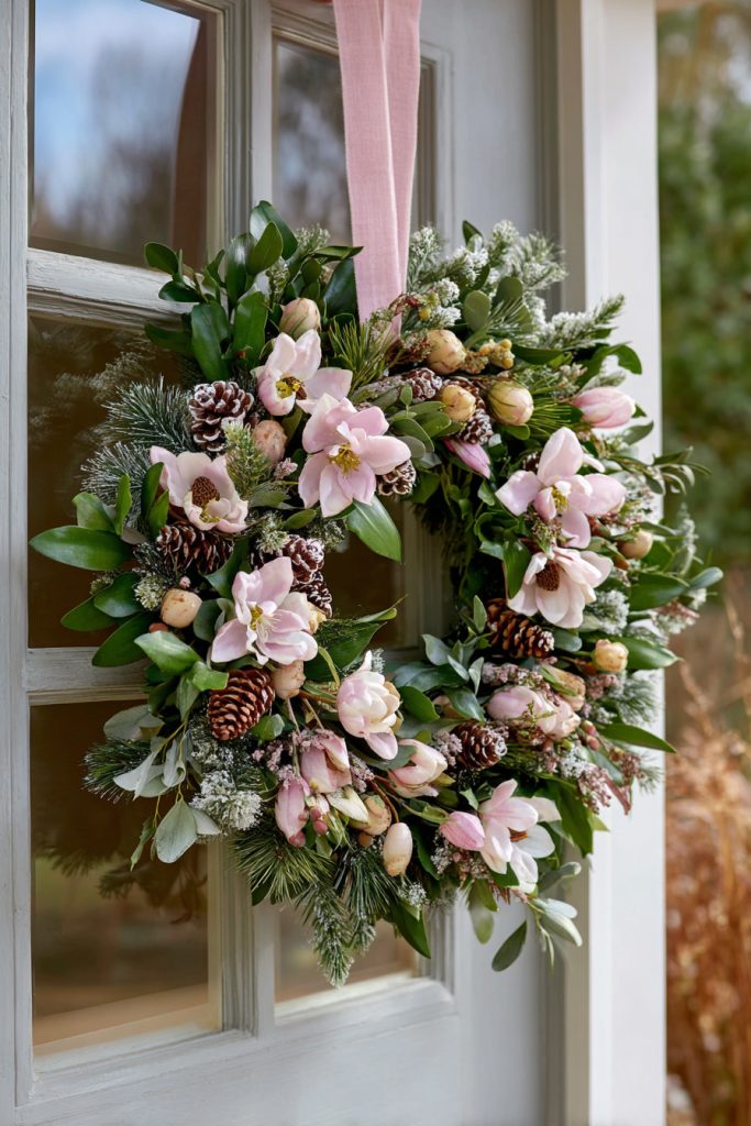 You can add a gentle touch of color with a soft pink winter floral wreath. It features delicate flowers that bring a calm, sweet look to your front door.