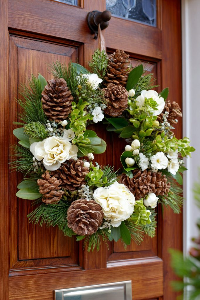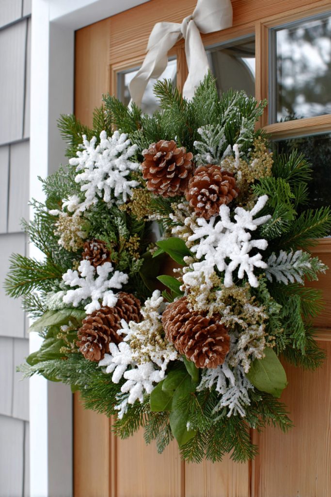 You can add a festive sparkle to your front door with a wreath that mixes glittering snowflakes and pinecones.