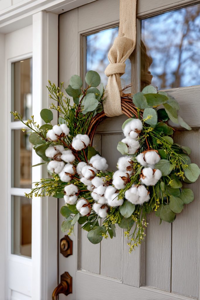 You can add a natural look to your front door with this wreath. It combines cotton bulbs and wildflowers on a simple frame.