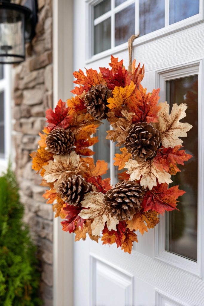 You’ll like this wreath if you enjoy natural, cozy looks. It blends bright maple leaves with pinecones for a warm, winter feel.