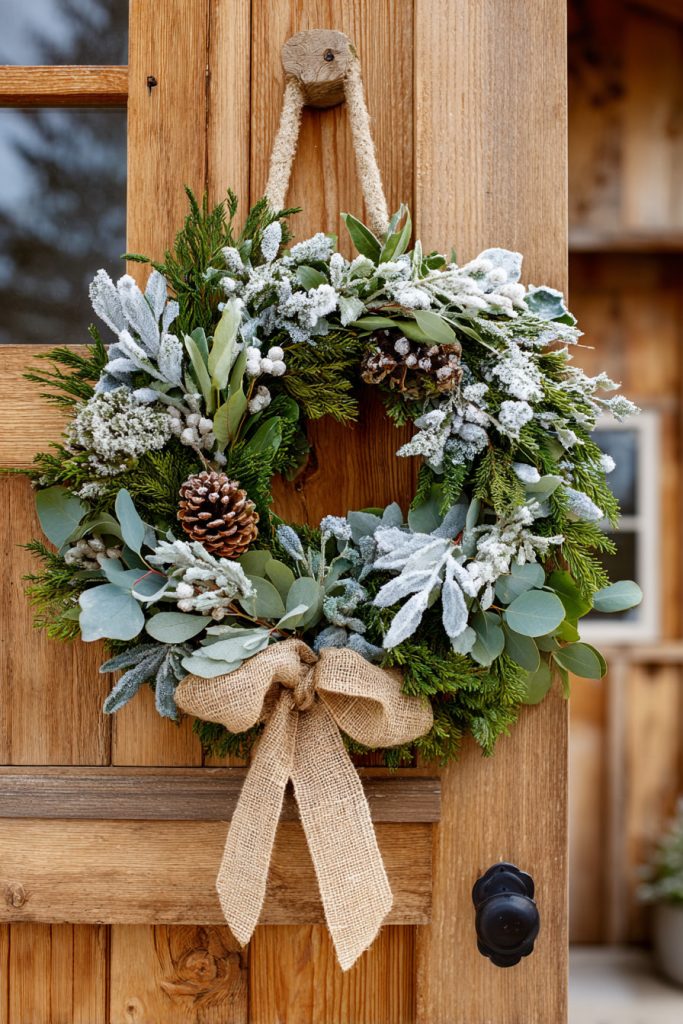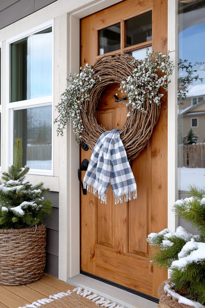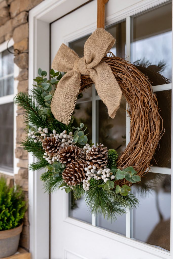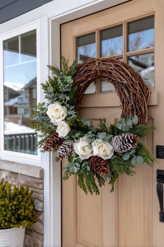 You can add a natural touch to your front door with a winter birch twig wreath. It features white and gray birch branches with pinecone and leaf accents. This wreath has a simple, fresh look that works well beyond the holiday season. It’s perfect if you want winter decor without the Christmas theme.